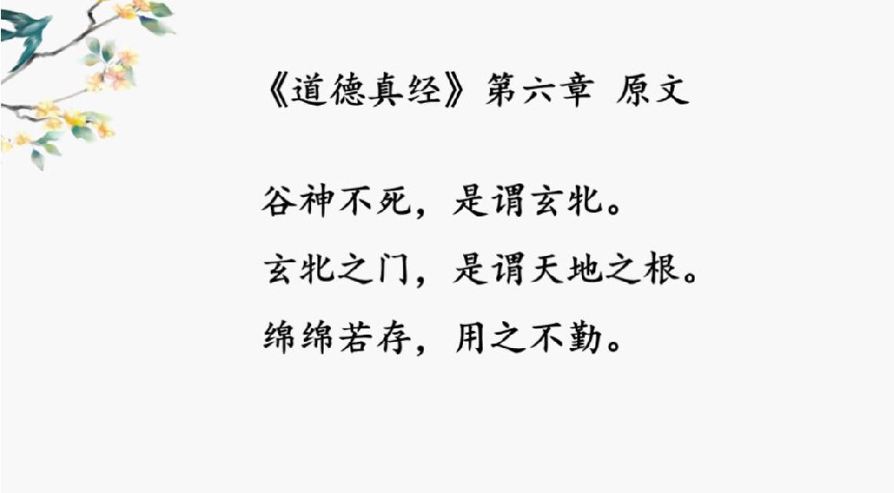 【原文】谷神不死①,是谓玄牝(pìn)②。玄牝之门,是谓天地根③。绵绵若存④,用之不勤⑤。【注释】①谷:形容虚空。神:形容不测的变化。②玄牝(pìn):象征深远而看不见的生育万物的总根源,这里用以形容“道”的不可思议的生殖力。牝,生殖。③是谓:这叫作。④绵绵:冥冥无形象,连续不断的样子。⑤不勤:不劳倦,不