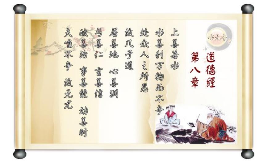 【原文】上善若水①。水善利万物而不争,处众人之所恶②,故几(jī)于道③。居善地④,心善渊⑤,与善仁,言善信,政善治⑥,事善能,动善时。夫唯不争,故无尤⑦。【注释】①上善:最高等的善。若:像。②处:停留、居住之意。③几(ji:一声):作“接近”解。④地:低下、卑下的意思。⑤渊:深的意思。⑥正:行政的意思。⑦