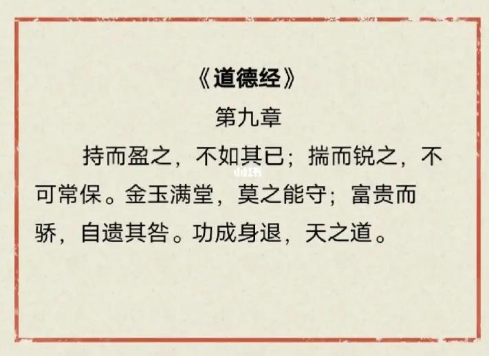 【原文】持而盈之①,不如其已②;揣而锐之③,不可长保。金玉满堂,莫之能守④;富贵而骄⑤,自遗其咎(jiù)⑥。功遂身退,天之道也。【注释】①盈:满的意思。②已:动词,停止的意思。③揣:捶打,敲打的意思。④莫:代词,“没有谁”的意思。⑤而:这一章三个“而”,均为连词,“而且”、“并且”的意思。⑥咎(jiù