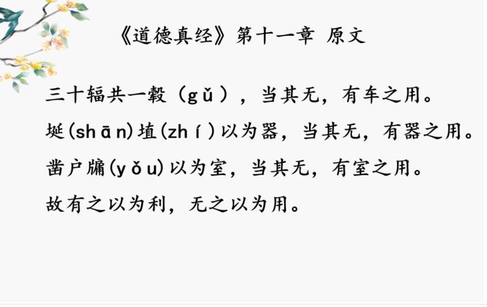 【原文】三十辐①,共一毂(gǔ)②,当其无,有车之用。埏(yàn)埴(zhì)以为器③,当其无,有器之用。凿户牖(yǒu)以为室④,当其无⑤,有室之用。故有之以为利,无之以为用。【注释】①辐:车轮上的直棍,有如自行车的钢丝。三十辐,是一个车轮直棍的数目。②毂(gǔ):即车轮中心穿车轴的圆木.北方叫它“车头”