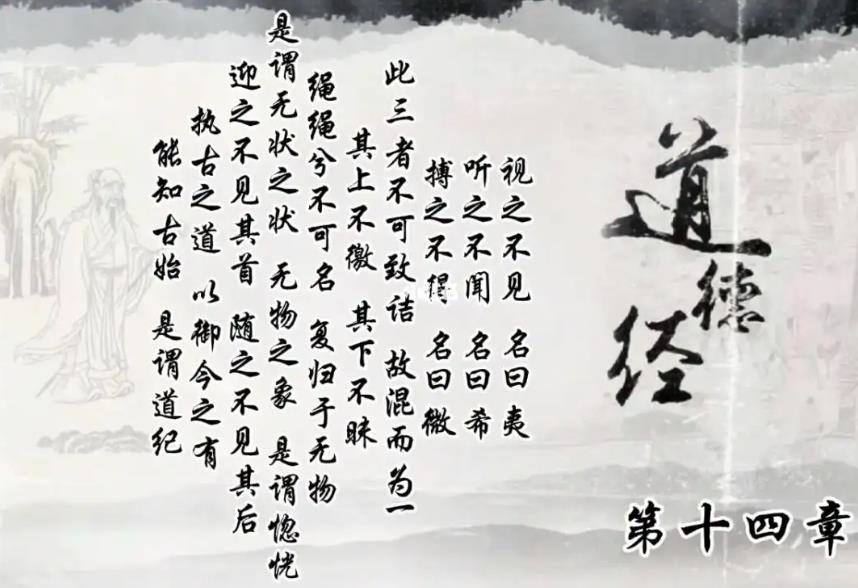 【原文】视之不见,名曰夷①;听之不闻,名曰希②;搏之不得,名日微③。此三者不可致诘(jié)④,故混而为一⑤。其上不皦(jiǎo)⑥?其下不昧(mèi)⑦,绳(mǐn)绳兮不可名⑧,复归于无物。是谓无状之状,无物之象,是谓惚恍⑨。迎之不见其首,随之不见其后。执古之道⑩,以御今之有⑪。能知古始⑫,是谓道纪⑬。【