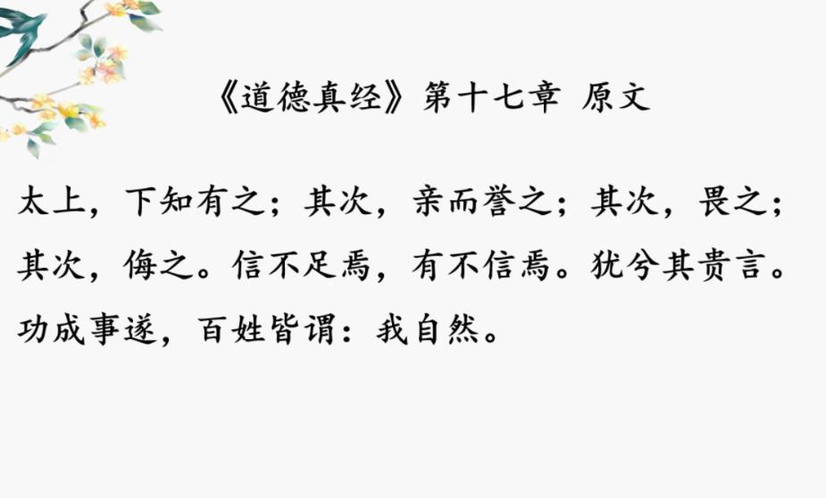 【原文】太上①,下知有之;其次,亲而誉之。其次,畏之。其次,侮之。信不足焉,有不信焉。悠兮其贵言③。功成事遂③,百姓皆谓:我自然。【注释】①太上:最上等的。②贵言:珍惜言辞,即很少发号施令。③事遂:把事情做好了。【译文】圣人治民,人民感受不到他的存在:其次的统治者,人民亲近他、赞誉他;再次的统治者,人