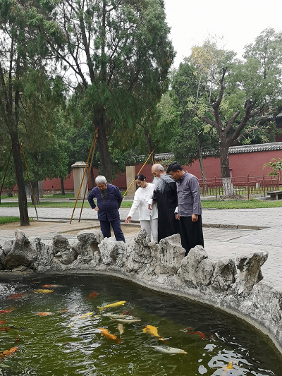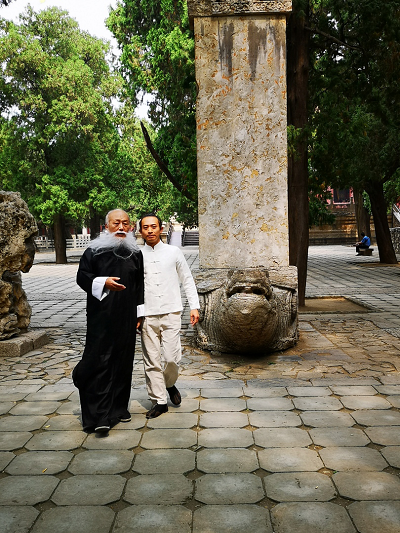 附图:文始派当代部分传承人合影(己亥年摄于泰山)。居中为宁象理先生,右一宁阳修,右二黄紫檀,左一于心本,左二段果敏。